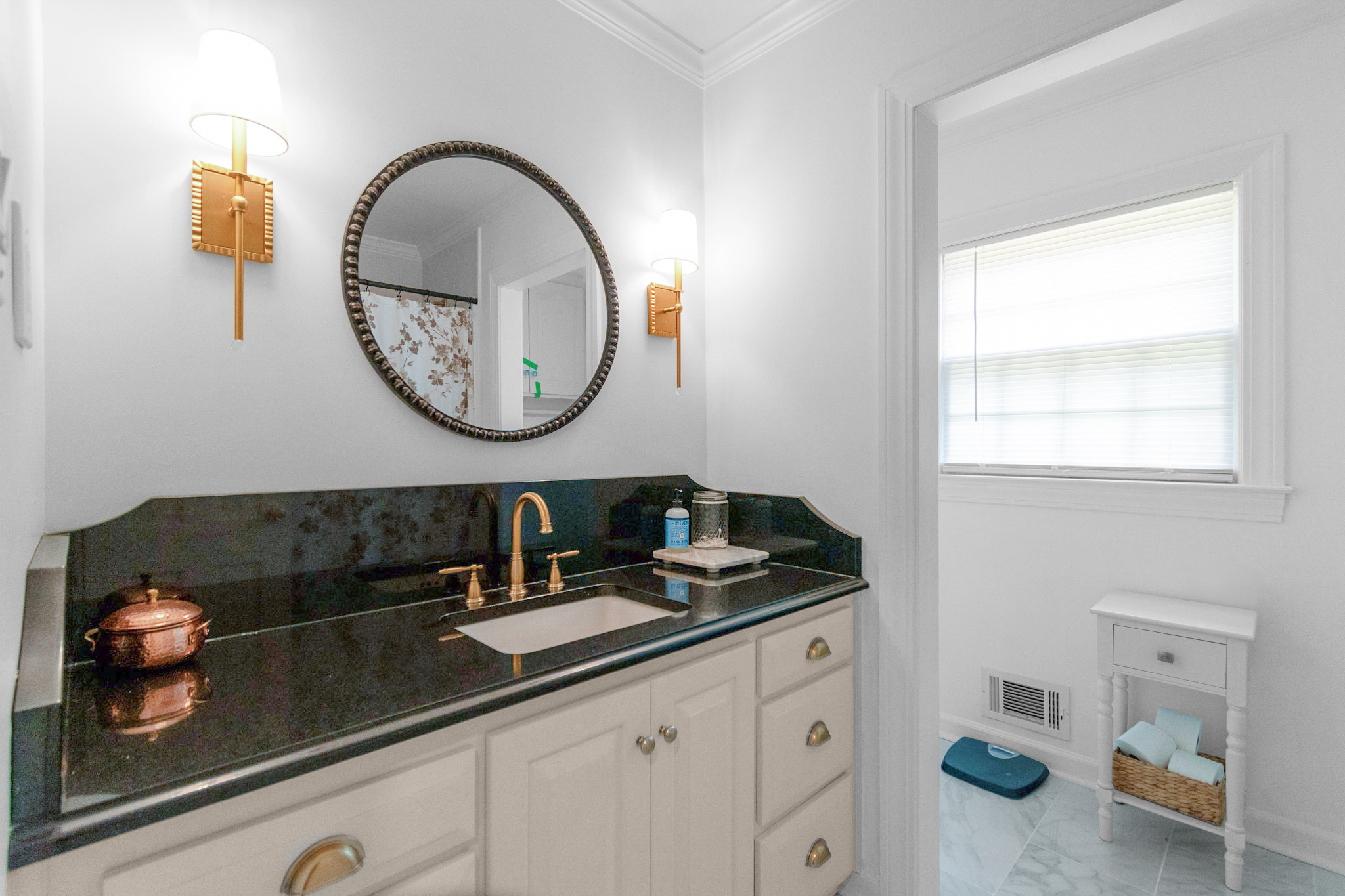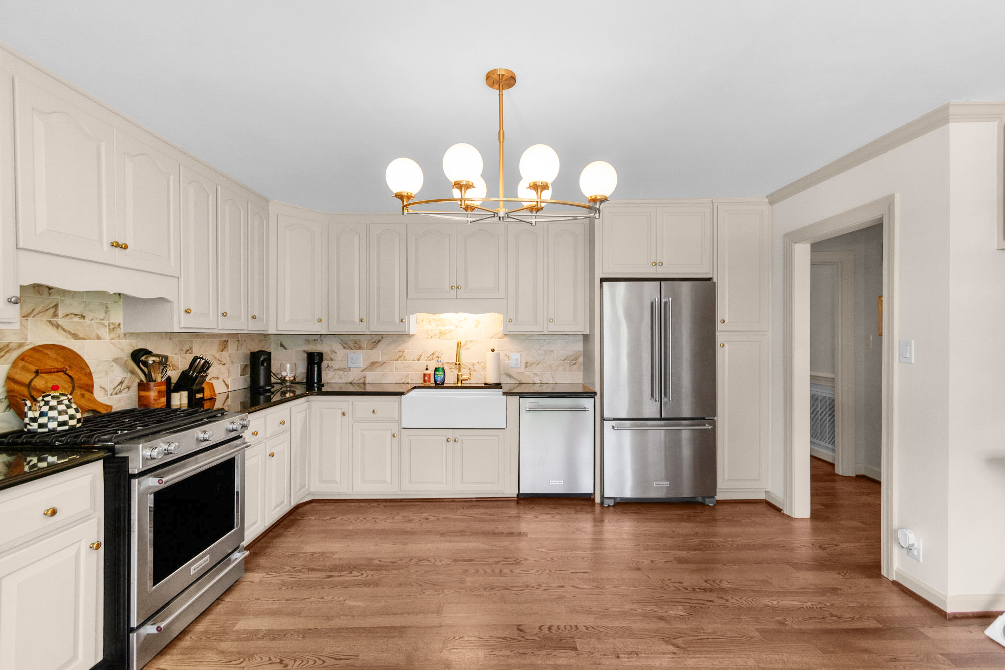 The heart of the home unfolds in the spacious kitchen, where culinary dreams come to life. Beautiful granite countertops complement the farmhouse sink with pull-down faucet, while the tile backsplash adds character and charm. The gas range makes cooking a pleasure, surrounded by ample cabinetry that provides abundant storage. The adjacent breakfast nook offers casual dining with garden views, while the versatile flex room can transform into a home office, additional breakfast area, or whatever your lifestyle demands.